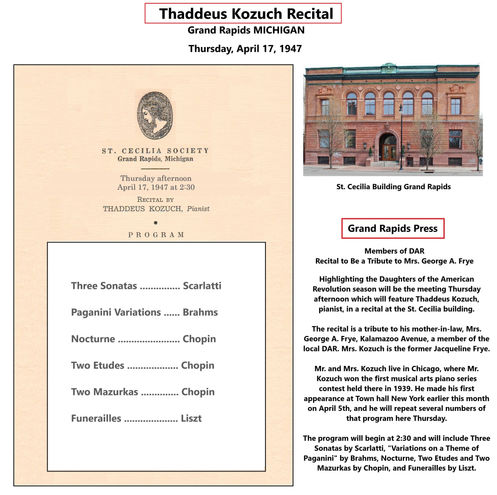 PostWar 1940's --- Upon return from Europe, after being honorably discharged from the US Army, and regaining his memory of a normal life as a musician, Thaddeus Kozuch once again was teaching and concertizing. He recorded his first and only commercial recordings, the 1947 "Concert Miniature" album, a collection of shorter works (as required to fit) on 78-rpm discs. He performed in numerous concerts and recitals during this period. His successful 1947 New York Town Hall Recital was favorably received by the press, as was his Grieg piano concerto performance with Chicago's Grant Park Symphony Orchestra.